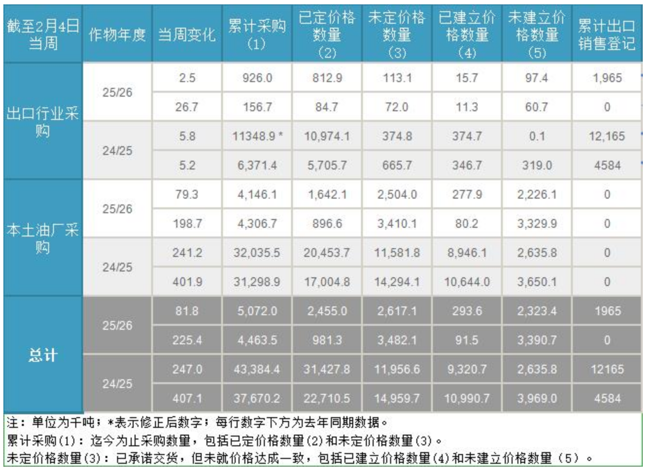 截至2月4日,25/26年度大豆累计出口销售登记数量为196.5万吨,24/25年度大豆累计出口销售登记数量为1216.5万吨。