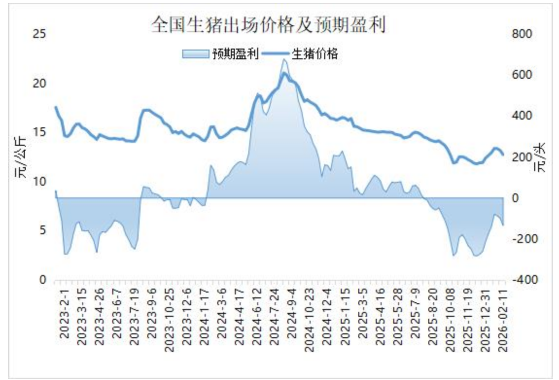 节前养殖端纷纷集中出清,市场猪源供应充足,加之春节备货接近尾声,猪价跌破13元关口,养殖亏损幅度进一步扩大。国家发改委价格监测中心披露的数据显示,2026年2月第2周,全国生猪出场价格为12.75元/公斤,较前期下降3.26%。按目前价格及成本推算,未来仔猪育肥模式的生猪养殖头均亏损134.06元。