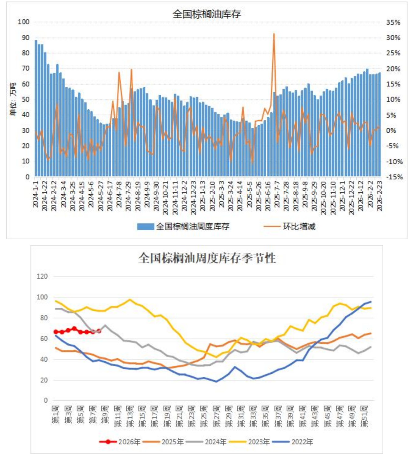春节假期期间,受前期采购集中到港影响,国内棕榈油库存维持小幅增长。机构监测数据显示,截止到2026年第8周末,国内棕榈油库存总量为67.17万吨,较上周的66.25万吨增加0.92万吨;合同量为2.79万吨,较上周的3.24万吨减少0.45万吨。