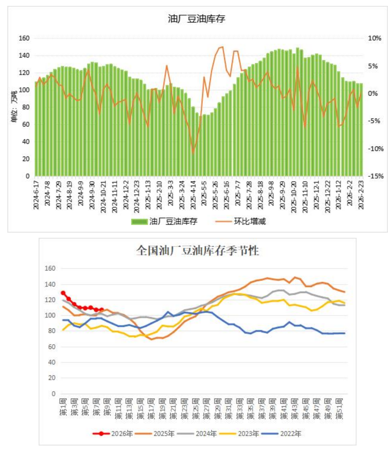 春节前一周,随着油厂开机率快速下滑,豆油产量减少,油厂积极出货,豆油库存减少近3万吨。春节当周,市场交易基本停滞,豆油库存大体持稳。机构监测数据显示,截止到2026年第8周末,国内豆油库存量为106.91万吨,较上周的106.96万吨减少0.05万吨,环比下降0.05%。其中:沿海库存量为98.02万吨,较上周的98.07万吨减少0.05万吨,环比下降0.05%。