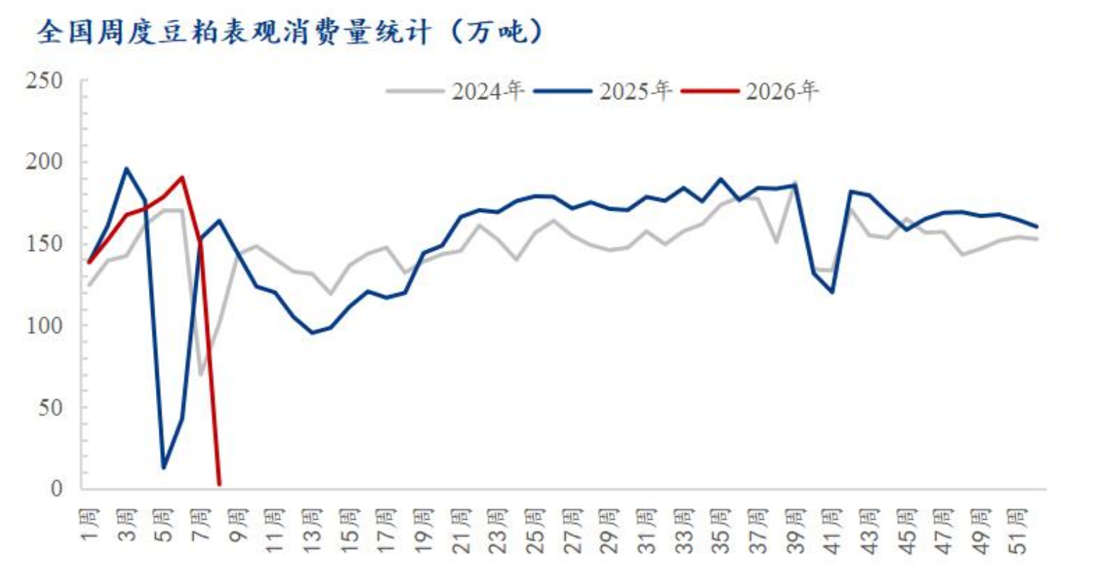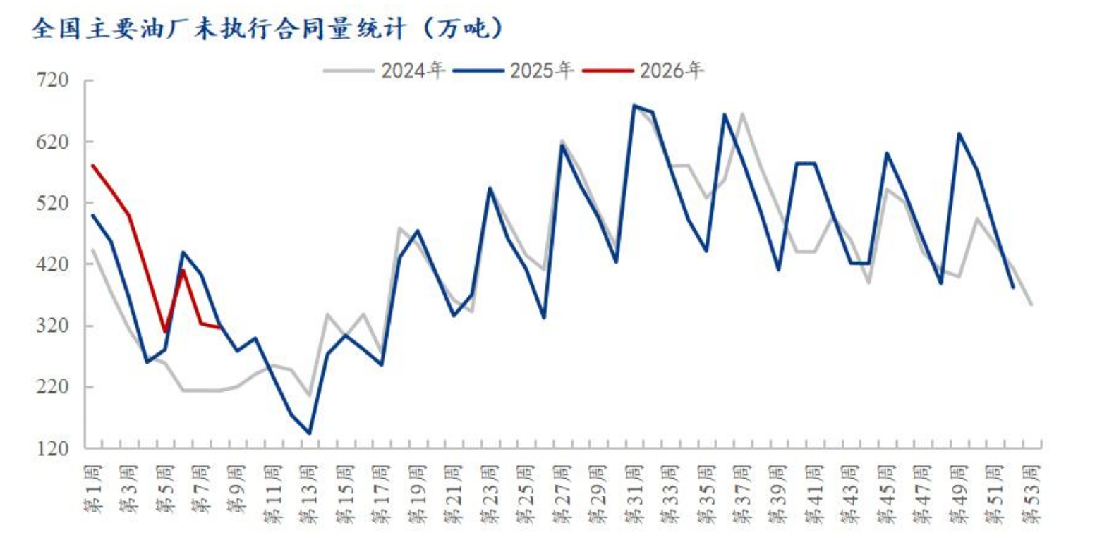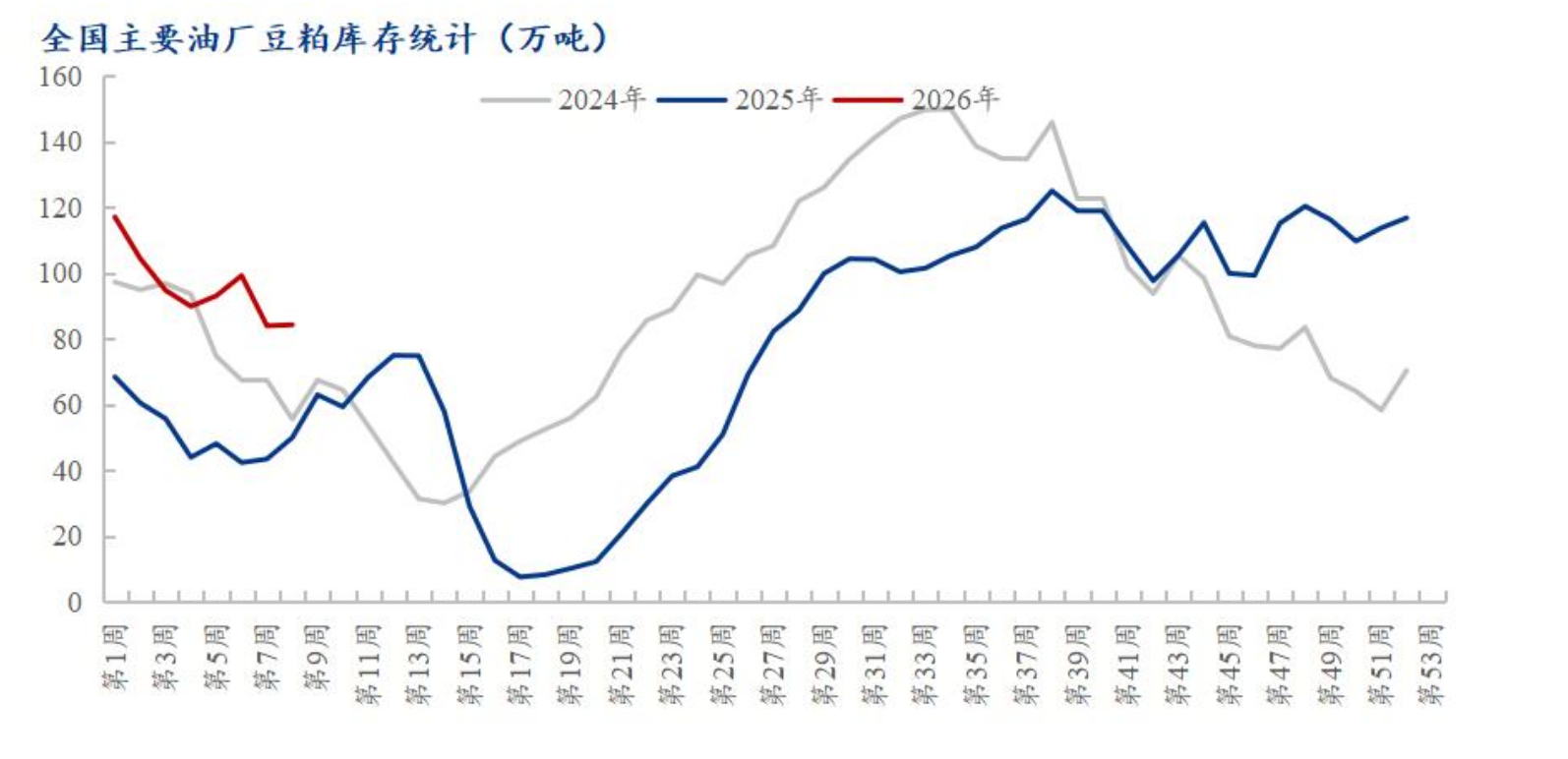 据Mysteel对国内主要油厂调査数据,2026年第8周,全国主要油厂大豆库存上升,豆粕库存上升,未执行合同下降。其中,