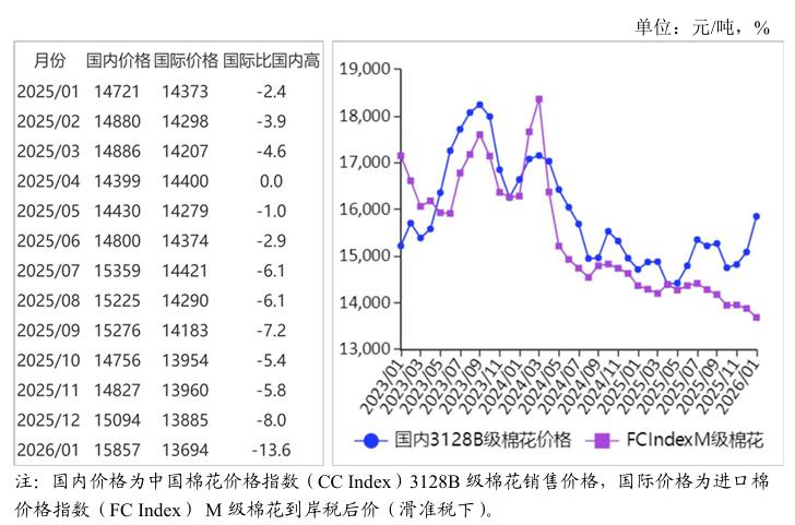 据农业农村部发布的农产品供需形势分析月报,国内市场:春节前纺织厂补库渐近尾声,2026年新疆棉花种植面积调减信息已被市场逐步消化;2026年度棉花