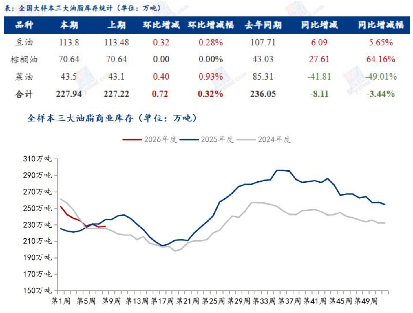 截至2026年2月20日,全国大样本豆油、棕榈油、菜油三大油脂商业库存总量为227.94万吨,较上周增0.72万吨,增幅0.32%;同比去年减8.11万吨,减幅3.44%。