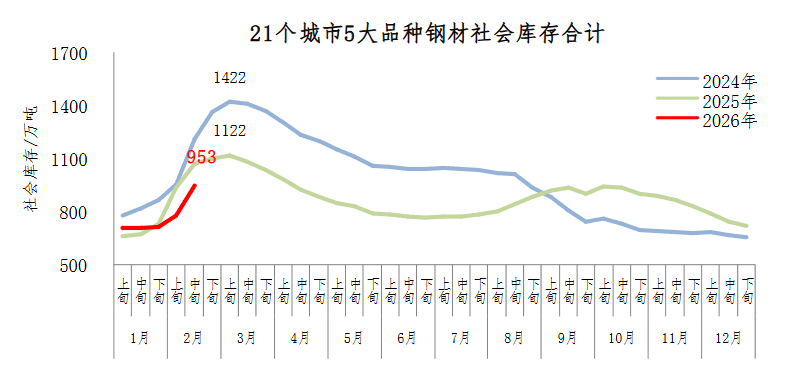 中钢协:2月中旬钢材社会库存953万吨,环比增加172万吨,上升22.0%