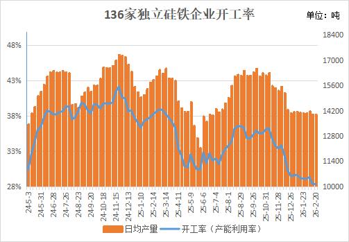 据Mysteel,硅铁主产区内蒙、宁夏开工稳定,供应端无明显收缩。Mysteel最新统计全国136家独立硅铁企业样本开工率为28.35%,环比持平;日均产量为14005吨,环比持平。