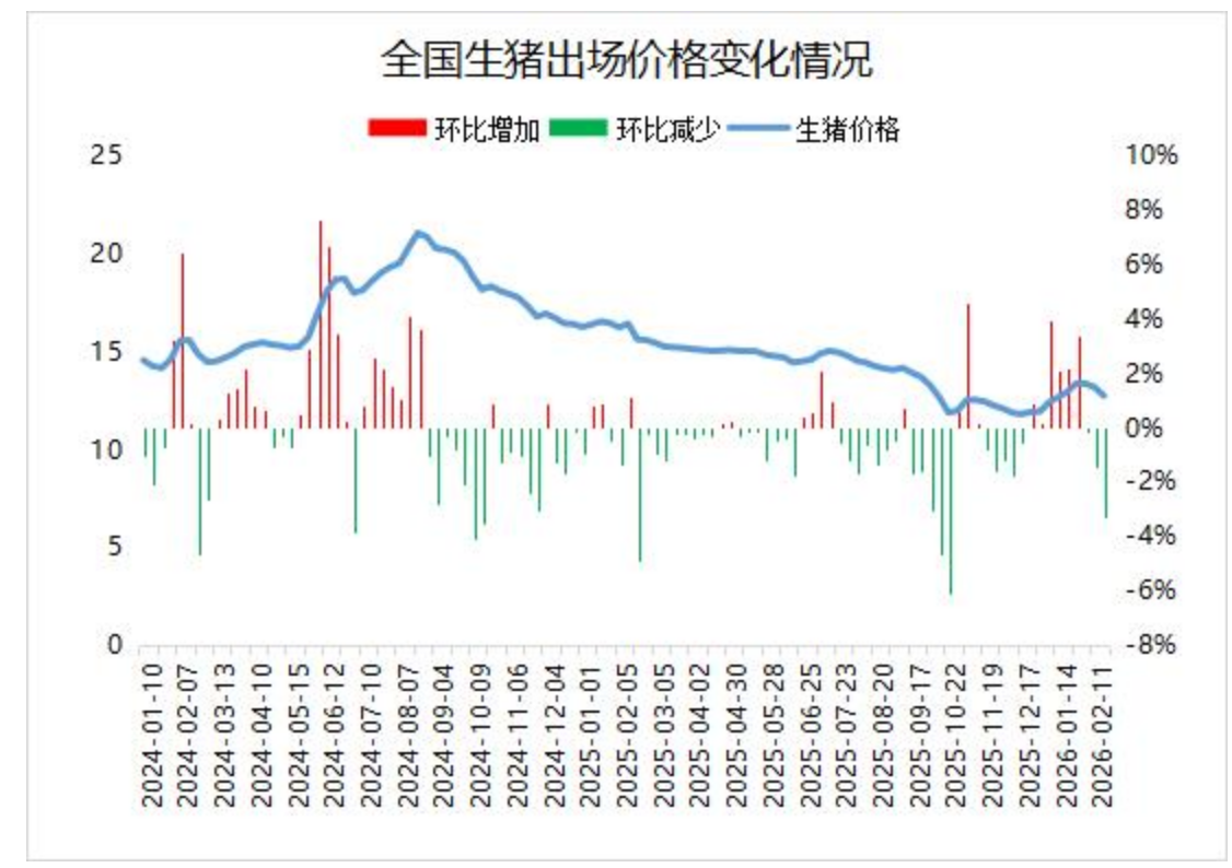 春节前养殖端避险情绪升温,纷纷抢在节前集中出清猪源,市场猪源供应充足。春节备货接近尾声,终端消费未迎来爆发式增长,居民采购基本收尾,餐饮消费未能形成有效拉动,屠企压价收猪意愿强烈。国家发改委价格监测中心披露的数据显示,2026年2月第2周全国生猪出场价格为12.75元/公斤,较前期下降3.26%。