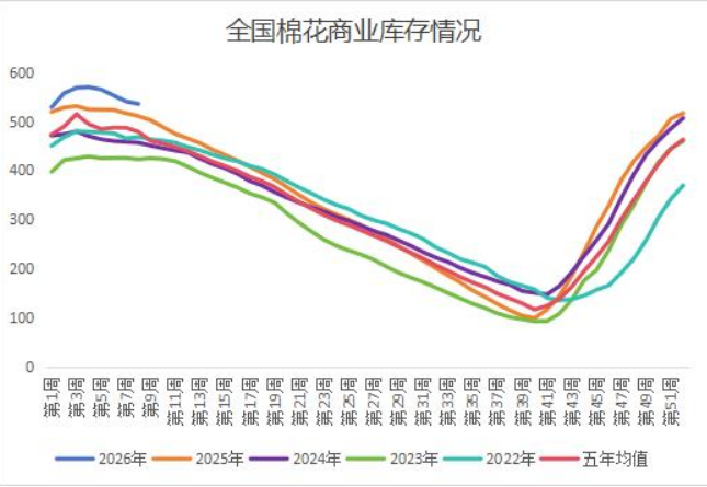 春节期间下游采购量有所减少,新疆纺企稳定生产,内地企业陆续放假,全国棉花商业库存呈下降态势。据Mysteel调研显示,截止2026年02月22日,棉花商业总库存535.54万吨,环比上周减少5.12万吨,减幅为0.95%。其中,新疆地区商品棉421.31万吨,周环比减少5.60万吨,减幅为1.31%。内地地区商品棉60.82万吨,周环比增加0.29万吨,增幅为0.48%。