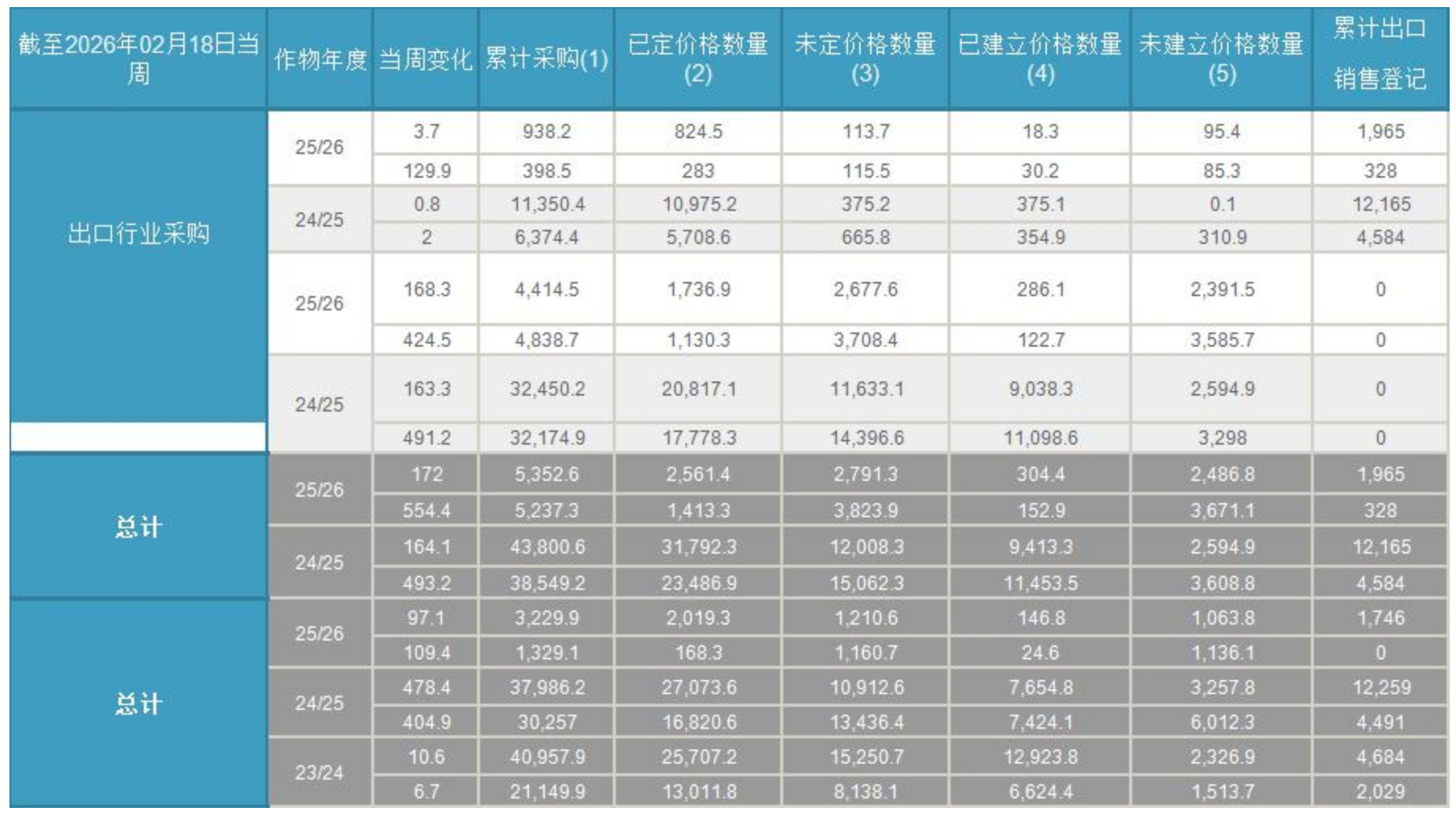 截至2月18日,2024/25年度大豆累计出口销售登记数量为1225.90万吨,2025/26年度大豆累计出口销售登记数量为174.60万吨。