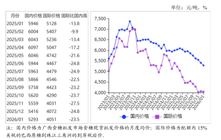 据农业农村部发布的农产品供需形势分析月报,国内市场:南方甘蔗糖生产有序推进,销售进度同比偏慢,工业库存季节性累库,预计国内糖价偏弱运行。国际市场:泰国、印度产量增加,巴西产量维持高位,同时消费不旺,当前国际食糖供大于求格局基本形成,预计国际糖价低位震荡。