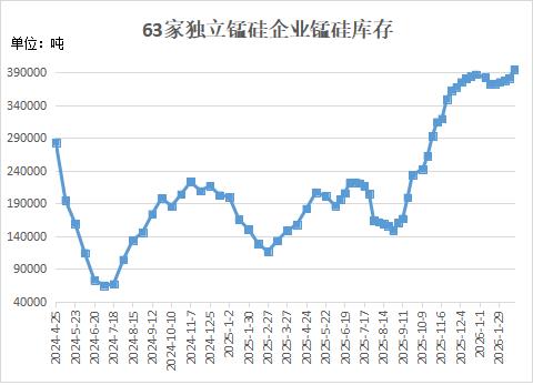 据Mysteel,受春节期间物流迟缓以及部分产区交投清淡影响,近期锰硅企业库存出现一定幅度累积。Mysteel统计全国63家独立硅锰企业样本全国库存量为394800吨,环比增加13000吨,再创近年来新高。