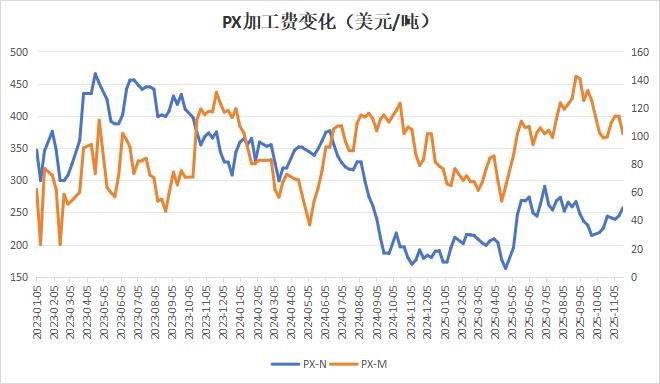 据隆众资讯,截至11月20日当周,本周PX和石脑油价差上涨、PX和MX价差降低。歧化效益偏低,韩国工厂运行负荷低,支撑周内PXN继续上涨。周期内,PX-N平均257.35美元/吨,环比增加12.64美元/吨,PX-M平均101.6美元/吨,环比减少4.86美元/吨。