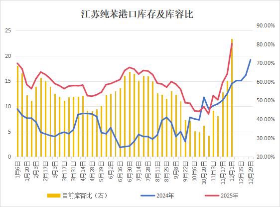 截至12月1日,江苏港库大幅拉升,纯苯库存周增36.59%