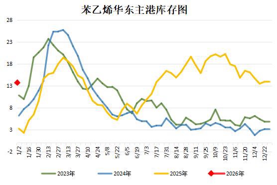 截至1月5日,下游刚需恢复提升,苯乙烯港库周降4.68%