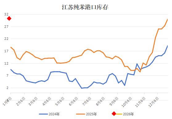 截至1月5日,江苏纯苯港口延续累库,库存同比增加71.71%