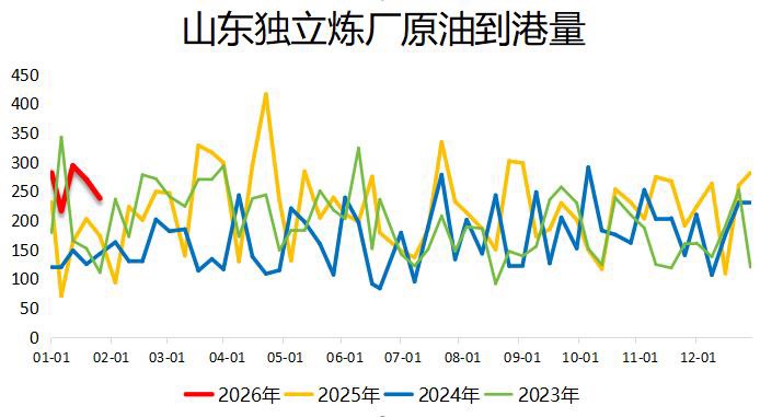 截至1月25日当周,山东炼厂原油到港量二连跌,同比处于偏高水平