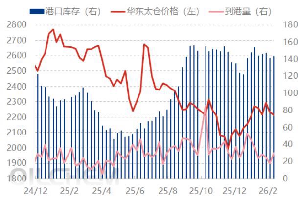 据隆众资讯,截至2月11日,中国甲醇港口库存总量在143.22万吨,较上一期数据增加2.12万吨。其中,华东地区累库,库存增加3.66万吨,华南地区去库,库存减少1.54万吨。本周甲醇港口库存小幅累库,周期内显性外轮卸货计入19.81万吨。江苏地区提货在船发备货需求下表现尚可,整体汽运提货转弱;浙江地区终端刚需稳定,同样仍存备货雪求。本周华南港口库存小幅去库。广东地区周内少量进口及内贸船货抵港,主流库区提货量平稳,库存窄幅波动。福建地区周内仅有内贸船货补充,下游按需消耗,库存呈现去库。