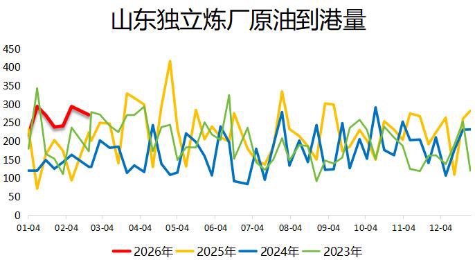 截至2月22日当周,山东炼厂原油到港量环比下降,仍显著高于去年同期
