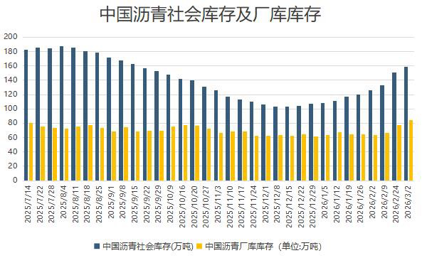截至3月2日当周,沥青社会库存连增八周,厂库库存同步环比增长