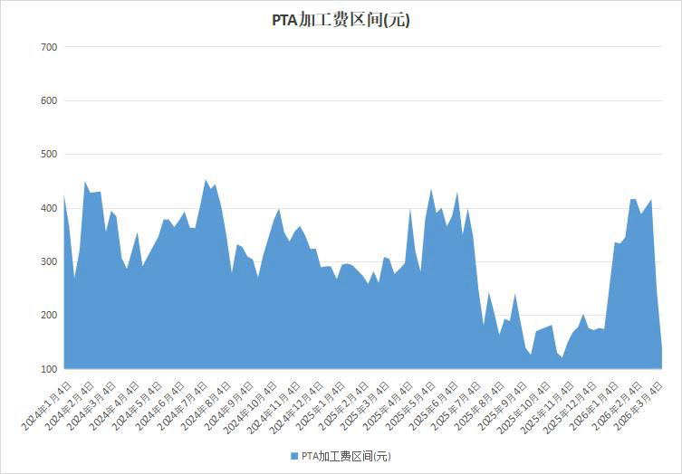 据隆众资讯,地缘因素引发油价重心走强,而终端表现不佳,下游负荷提升不及预期,原料价格涨幅大于PTA价格,本周PTA加工区间大幅下挫 。截止3月11日,中国PTA平均加工区间为140.05元/吨。