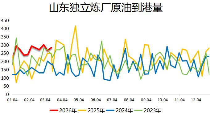 截至3月15日当周,山东炼厂原油到港量环比上涨,明显低于去年同期