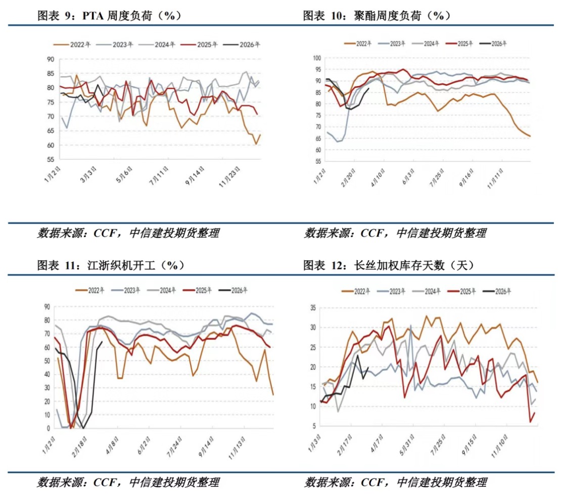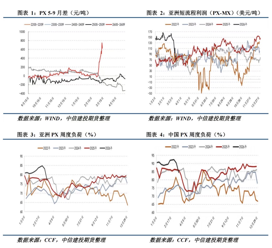 PX主力合约高位震荡,机构三发布观点称,在原油价格强势背景下,上游原料收紧进一步强化了对化工品价格的利多影响,化工品估值体系面临重构。价格的顶部将由需求定夺,只有当下游需求无法承接时,才会出现装置降负并压制价格。目前虽然下游复工节奏有所延后,但整体仍在复工过程中,尚未出现显著的逆季节性降负现象。短期来看,市场正从“冲突持续”的极端情绪中寻找方向,但基本面已发生的改变难以逆转,由于物流中断及炼厂降负,国内化工品市场开始交易现实供应缺口,预计PX5月期价后市将在成本走高和供给收缩等利多因素影响下反复创新高。策略上,PX 5月回调做多,支撑区域9700-10000,PX5-9月差在400以下逢低正套。4月去库预期、炼厂降负现实与终端承接能力,将是下一阶段的博弈核心,亦需关注交割期流动性危机。