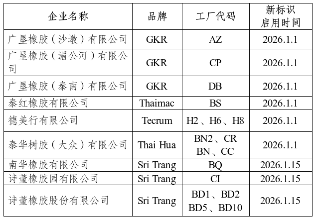 二、广垦橡胶(沙墩)有限公司等6家企业涉及11家工厂2026年1月1日(含)以后生产的20号胶新标识包装的产品,可入库生成标准仓单;1月1日以前生产的20号胶旧标识包装的产品仍然可以生成标准仓单用于交割。
