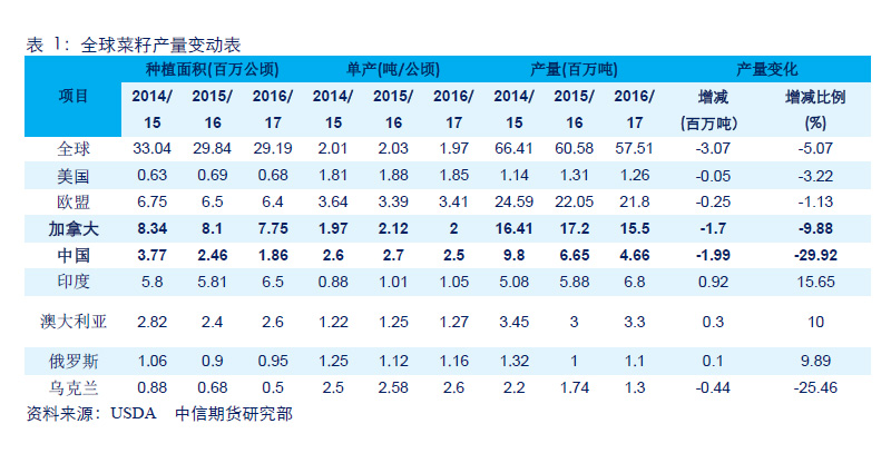 目前世界主要监测机构预期2016年油菜籽产量减少,菜籽供求处于紧平衡状态。据USDA最新供需报告显示,预计2016年全球油菜籽期末库存量为355万吨,较上年减少约30%,也是2004年以来的最低水平。在世界主要菜籽生产国和出口国方面,除印度、澳大利亚和俄罗斯油菜籽产量同比增加外,其他主要生产国产量均呈现不同程度下降。其中,USDA预计欧盟油菜籽产量由上年的2205万吨下降至今年的2180万吨,降幅为1.13%;加拿大油菜籽产量由1720万吨下降至1550万吨,降幅为9.88%;乌克兰油菜籽产量由175万吨下降至130万吨,降幅为25%;印度油菜籽产量由588万吨增加至680万吨,增幅为15%;澳大利亚油菜籽产量由300万吨增加至330万吨,增幅为10%,俄罗斯油菜籽产量由100万吨增加至110万吨,增幅为10%。从上面的数据分析可知油菜籽生产国的增加量要小于菜籽的减少量。因此,2016年世界油菜籽总产量仍然减少。且由于USDA报告中对中国油菜籽产量的统计数据采用的是中国官方数据1330万吨(市场预计中国油菜籽产量大约只有466万吨),使得世界油菜籽产量减少幅度只有3%,若将中国产量调整为市场预期产量,则全球油菜籽产量减少幅度为5%,全球菜籽供需则更加偏紧。