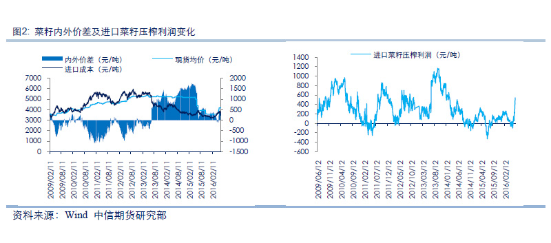 供给方面,由于国内菜籽产量大幅减少、国际菜籽减产预期强烈,新季菜籽供给量减少;且国内外菜籽价差处于较低水平,进口菜籽价格优势并不明显,预计后期菜籽进口量难有显著增加。预计后期国内菜籽菜粕供给日益趋紧。菜粕需求方面,根据水产品CPI走势以及前期调研情况,今年我国水产养殖业逐渐恢复,预计今年水产饲料产量较上年小幅增加,菜粕需求量较上年好转,且三季度为我国水产养殖旺季,菜粕需求量较大。此外,由于2016年以来豆粕价格持续上涨,豆菜粕价差不断扩大,豆粕对菜粕的替代压力逐渐缓解,这也有利于增加菜粕的需求量。综上,菜粕供给日趋减少、需求不断增加,预计后期菜粕供需日益偏紧,菜粕期价上涨具有牢固的基本面作支撑。