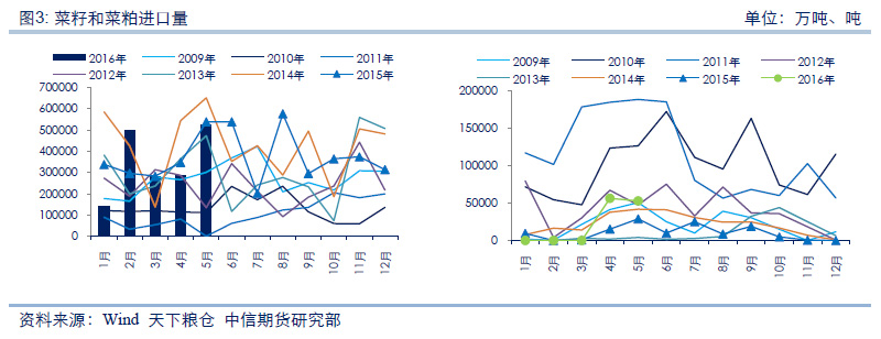 菜籽进口方面,中国政府决定从2016年9月1日起提高进口加拿大油菜籽的质量标准,预计提高后菜籽每吨进口成本将会增加200元左右。据wind数据显示,6月份以来内外菜籽价差均值在400元/吨左右,进口菜籽压榨利润均值约为230元/吨;2016年以来内外菜籽价差均值约为200元/吨,进口菜籽压榨利润均值约为120元/吨。从以上数据可以看出,如果后期进口菜籽成本增加200元/吨,则意味着进口菜籽并无明显价格优势,且进口菜籽的压榨利润也将处于盈亏边界。此外,近期国产菜籽价格的大幅上涨是基于菜籽的大幅减产,但目前的高价处于“有价无市”的状态,后期能否维持在较高水平,本人持怀疑态度。另,由于国外油籽减产,菜籽进口的竞争压力势必加大,且近日国际菜籽价格的下降是由于大豆价格回调所引起的,后期大豆价格将重回上涨通道,预计后期国际菜籽价格也将止跌回升。如此以来,进口菜籽并无价格优势,我国菜籽进口量也难有显著增加。 2016年1-5月菜籽进口量(前4个月菜籽进口量为173万吨,较上年同期的180万吨减少4%)来看,今年菜籽进口量或与上年基本持平,预计为450万吨。