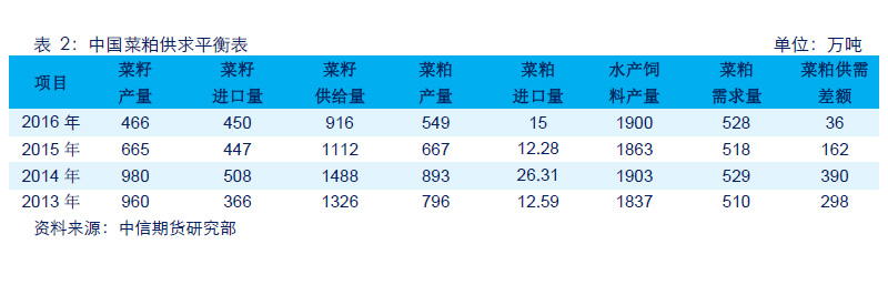 菜粕进口方面,由于我国菜籽压榨产能过剩、进口菜粕质量较差,我国一直以来以进口菜籽为主,菜粕进口量较小,近3年进口菜粕约占国内菜粕供给的2%。如我国2013至2015年菜粕进口量分别为12.59万吨、26.31万吨和12.28万吨,分别占菜粕供给总量的1.56%、2.86%和1.81%。2016年1-3月份我国没有进口菜粕,4-5月份菜粕进口量为10.90万吨。预计今年我国菜粕进口量在15-20万吨之间,进口菜粕占比仍然较低。 根据以上分析,在内外菜籽减产、进口菜籽成本增加及进口菜籽压榨利润较低的条件下,预计今年我国菜籽供给量将会减少,上文预计今年我国油菜籽产量为466万吨,菜籽进口量为450万吨,则今年我国菜籽总供给量约为916万吨,较上年的1112万吨减少17.63%;今年我国菜粕产量约为549万吨,较上年的667万吨减少约17.69%,菜粕进口量预计为15万吨,菜粕供给总量约为564万吨。根据水产饲料产量,今年菜粕需求量约为528万吨,则今年菜粕供需差额约为36万吨,较上年的162万吨减少77.64%。综上所述,预计后期我国菜籽菜粕供给日趋偏紧。