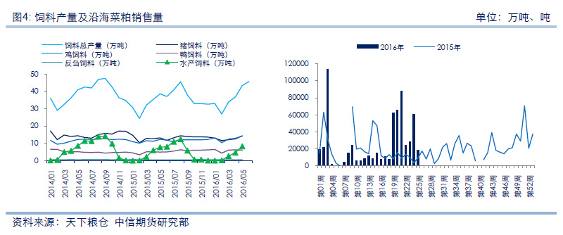 根据前期调研以及水产品CPI走势看,今年我国水产养殖业处于恢复期,预计今年我国水产品产量或略高于去年。根据前期调研情况显示,今年南方水产养殖业处于恢复期,鱼塘投苗量略好于去年,若后期未发生重大不利气象灾害,鱼价平稳上涨,今年淡水养殖业仍将有利可图,养殖场将会增加养殖量。预计今年我国水产饲料产量及需求量将会小幅增加。据中国渔业协会数据显示,2015年我国水产饲料产量为1863万吨,预计今年我国水产饲料产量为1900万吨,菜粕需求量预计为528万吨。又每年的3季度为我国水产养殖的旺季,菜粕需求量较高,预计后期菜粕需求将会增加,菜粕供求日趋偏紧。