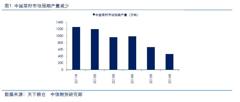 国产菜籽方面,由于2015年国产油菜籽不再实行临储政策,油菜籽价格大幅下降,农民收入锐减,致使2015/16年度油菜籽种植面积大幅减少,根据前期对江苏和安徽地区的调研,江苏今年油菜籽种植面积减少约30%,安徽地区油菜籽种植面积减少30-50%,且由于主产区受病虫害及天气影响,今年国产菜籽单产较低、质量较差,预计今年全国油菜籽产量较上年减少30%左右。根据往年统计数据显示,2015年我国油菜籽产量为665万吨,预计2016年国产油菜籽产量为466万吨。国内菜籽产量减少已成定局,预计后期国内菜籽供给将日趋偏紧。